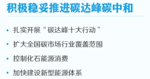 Actively and steadily promote carbon peaking and carbon neutrality. Establish a carbon footprint management system, further advance the energy revolution, control fossil energy consumption, and accelerate the construction of a new energy system. Strengthen the construction of large-scale wind and photovoltaic power bases and transmission channels, promote the development and utilization of distributed energy, develop new energy storage, promote the use of green electricity and international mutual recognition, leverage the backup role of coal and coal-fired power, and ensure the energy demand for economic and social development.